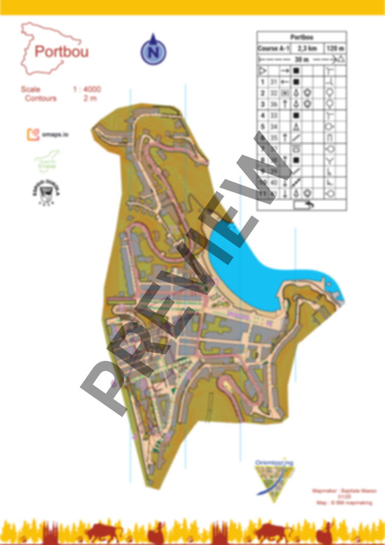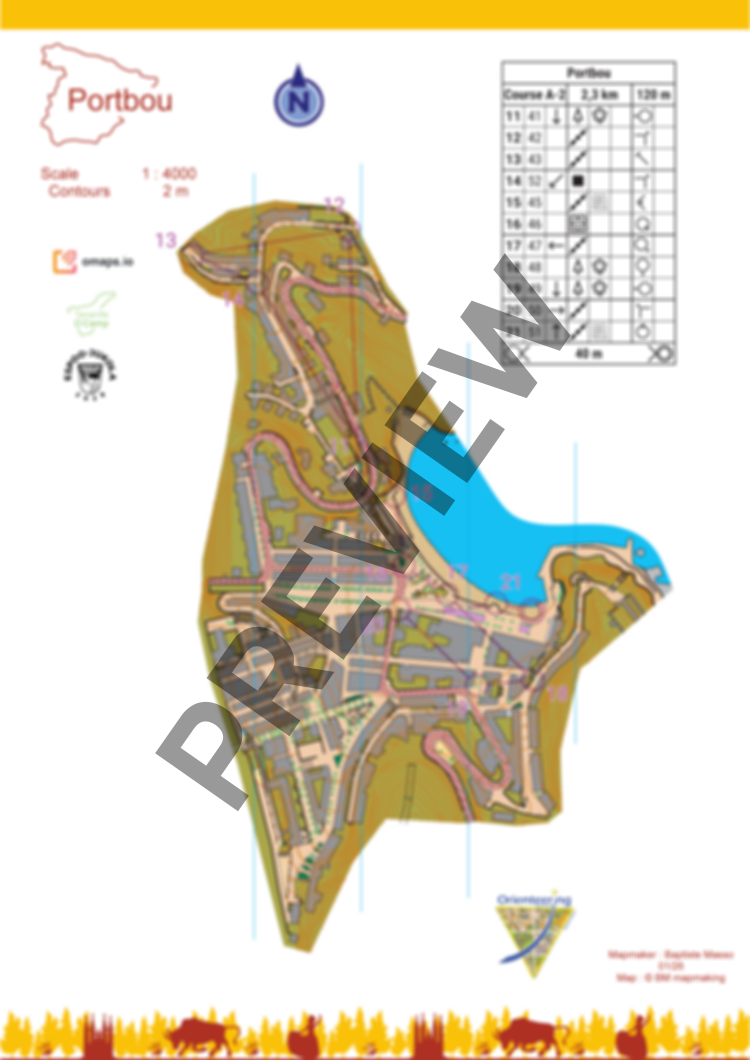 The course is 2,3km & 120m ↑ (real : 3,4km) with a flip map over. There is no flags on the terrain.