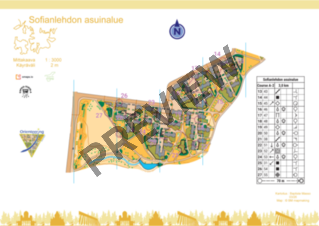 Tricky residential area with very similar buildings and backyards layouts. Fast terrain with almost no elevation changes. Quite a lot of private areas. Almost no traffic, watch out when crossing parking areas.