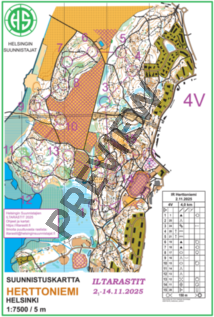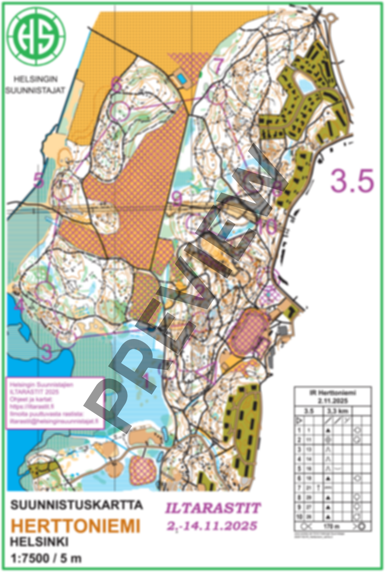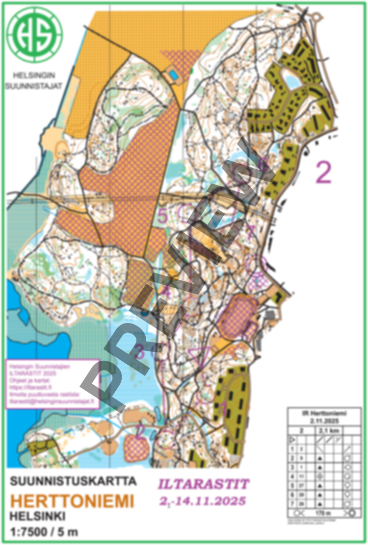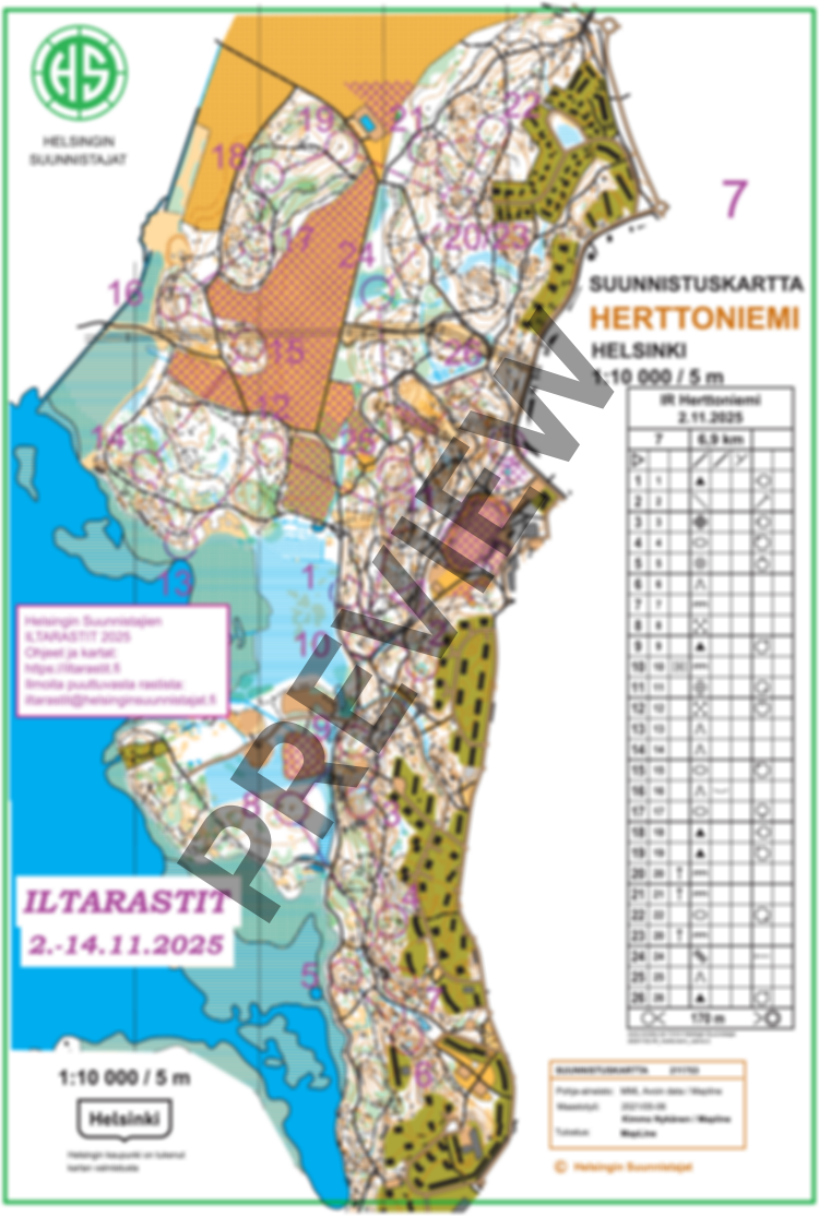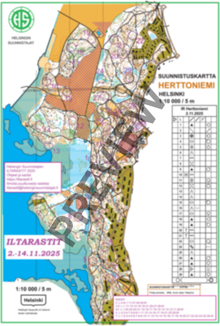 “Herttoniemen aluetta luonnehtivat jyrkkäpiirteiset rinteet ja monimuotoinen metsä. Iltarastien alue rajautuu aivan Herttoniemen asuinalueen tuntumaan. Hiihtolatuverkoston polut ja alueen halki kulkeva pyöräilyreitti tarjoavat selkeitä maastokohteita ja helpottavat suunnistustehtävien suorittamista. Pienet lehtien peittämät polut, tuulenkaadot sekä paikoin erittäin jyrkät rinteet tuovat oman haasteensa.