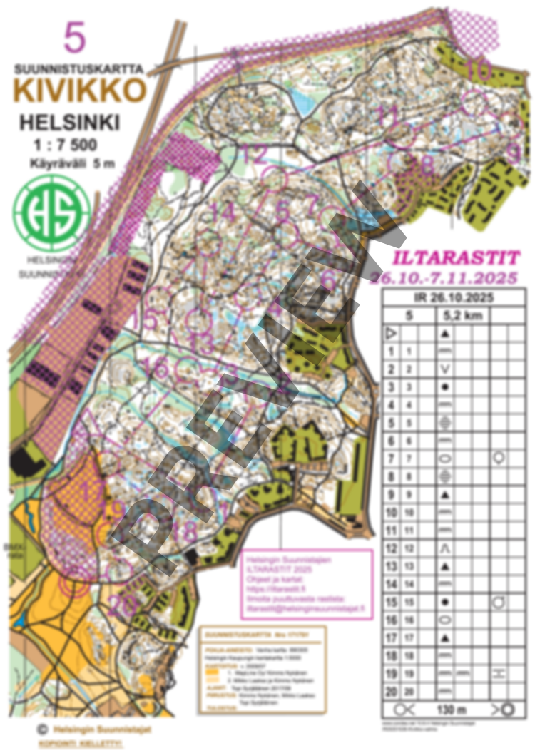 “Kivikon maastoa halkovat useat ulkoilutiet ja lukuisat polut tekevät maastosta nopean. Kuitenkin rikkonainen maasto, lukuisat kallioalueet ja 1. maailmansodan aikaiset juoksuhaudat tuovat vaativuutta suunnistukseen. Radat 4V ja 5 km kulkevat koko suunnistettavalla alueella. Vaikka maasto onkin nopeaa, runsas rastimäärä ja haastavat rastipaikat tuovat lisämaustetta pisimmillä radoilla. Lyhyemmillä 3,5 km ja 2 km radoilla rastit löytyvät tyypilliseen tapaan hieman helpommista paikoista.”