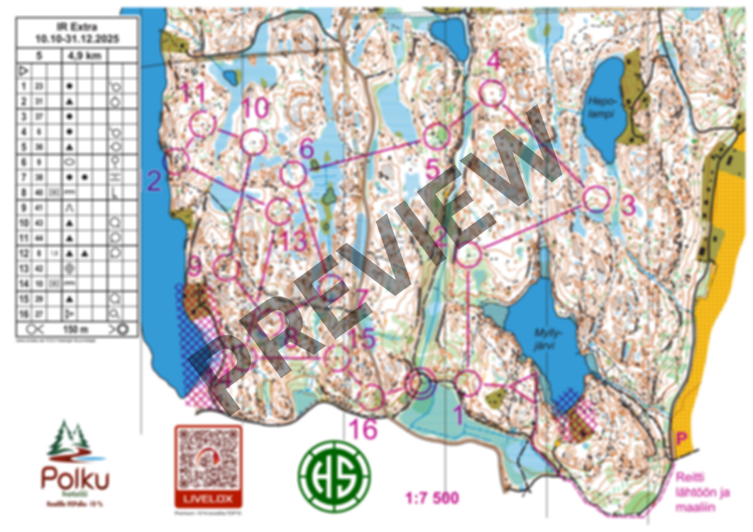 Keskimatkatyyppiset, runsasrastiset radat Myllyjärven hienossa maastossa Nuuksiossa. Suunnistusmaasto on nopeaa ja korkeuserot kohtuullisia.
