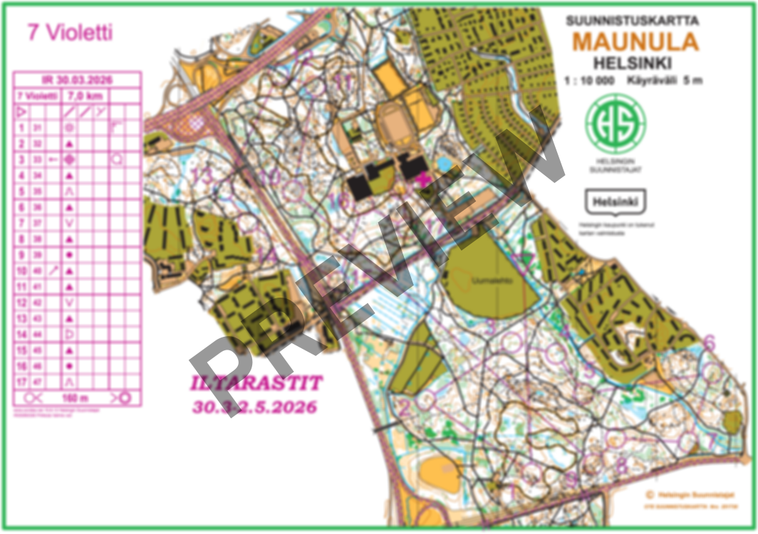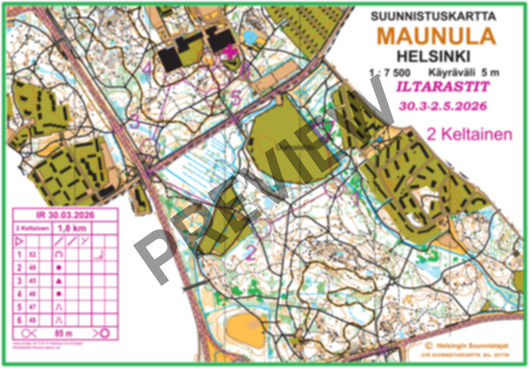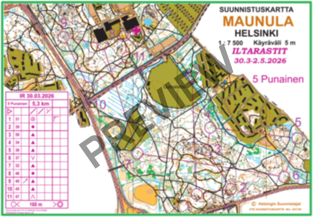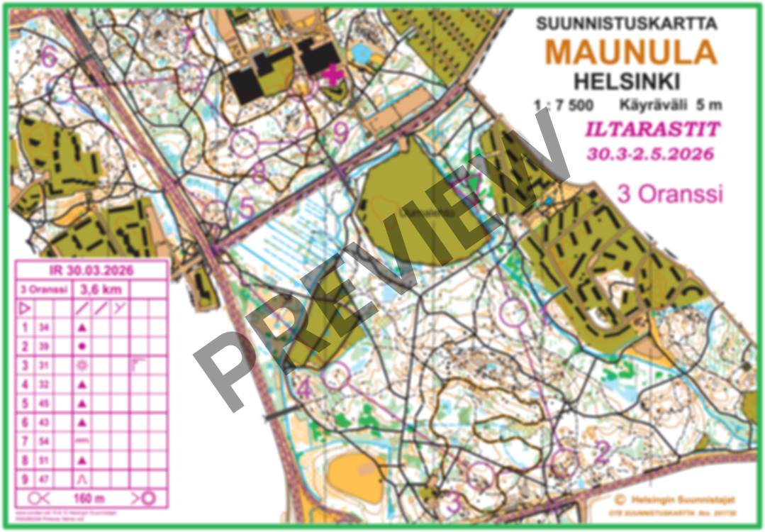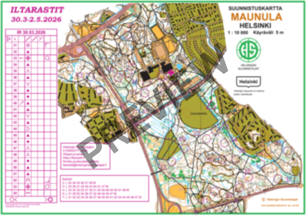 ”Kauden avaus suunnistetaan tutussa, mutta aina monipuolisessa Keskuspuiston maastossa. Radat suuntaavat Pirkkolasta etelään, tarjoten vauhdikkaita osuuksia myös Pirkkolan kallioilla sekä osalla ratoja reitinvalintoja aina Pohjois-Haagan puolelle. Maasto on ollut jo jonkin aikaa käytännössä lumeton, eli suunnistuksesta pääsee nauttimaan mukavan keväisissä olosuhteissa. Koejuoksuissa on todettu, että maasto on miellyttävä juosta, näkyvyys on hyvä ja aluskasvillisuus ei hidasta etenemistä.
