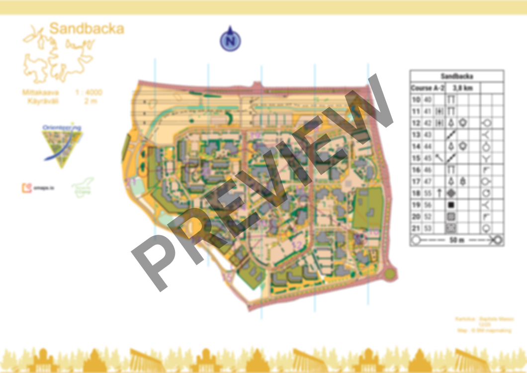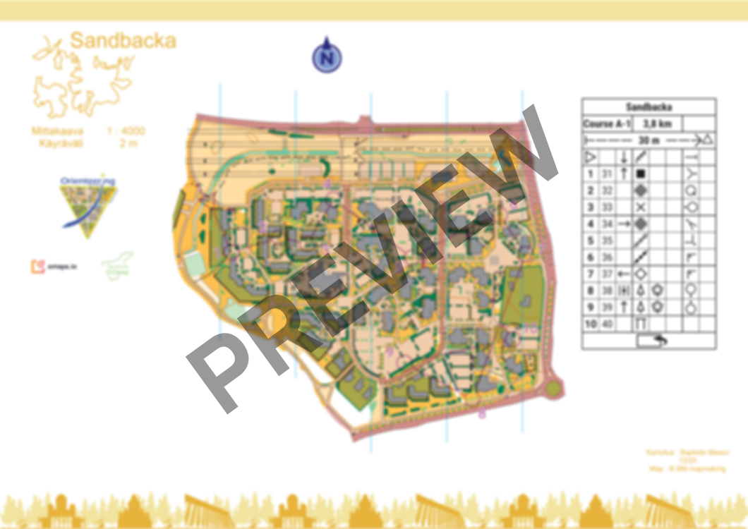 New map of Sandbacka. Mainly residential areas with detailed, tricky gardens and parks. Fast grassy and asphalt terrain, mostly flat. Some private areas and light traffic.