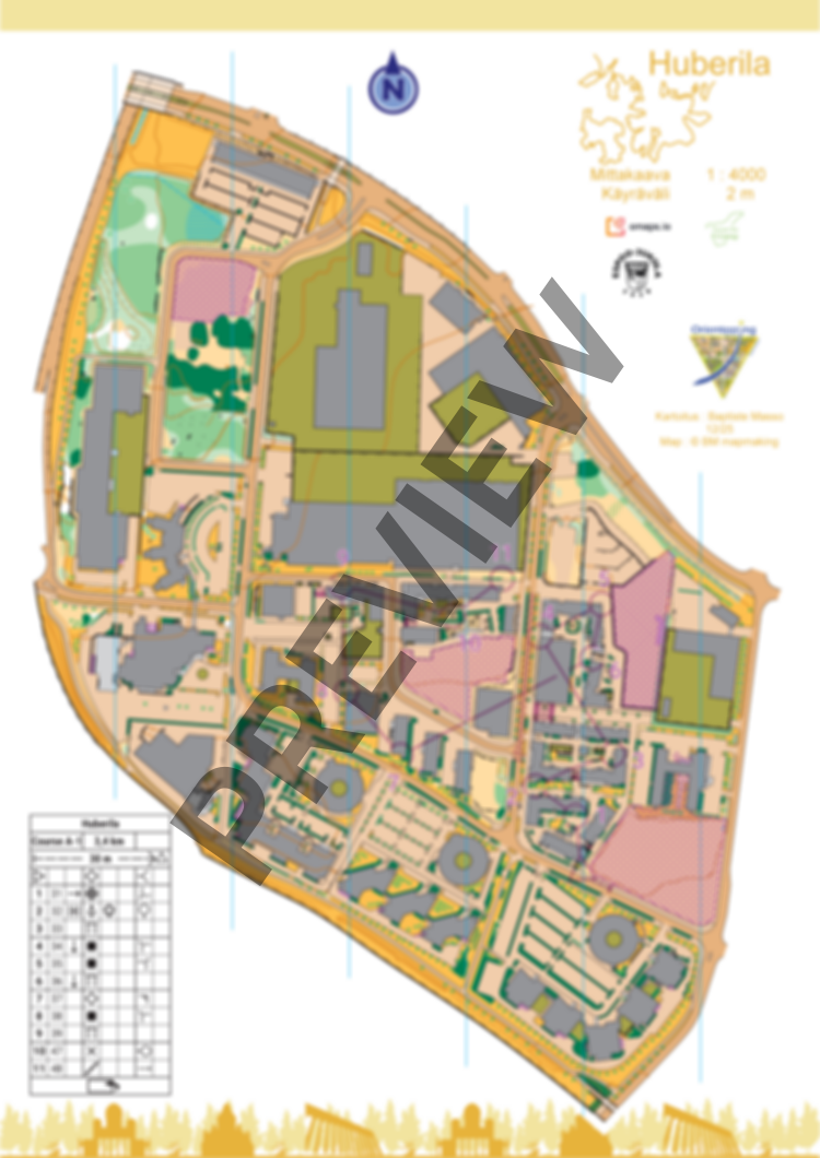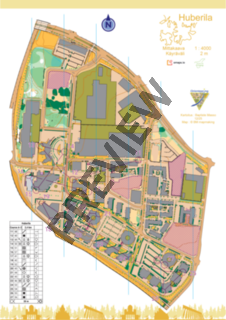 New map of Huberila, right next to Kehä III. A mix of residential areas, office buildings, and hotels. Quite open, with some fast grassy sections and children’s playgrounds. Very slight elevation changes. Some private areas.