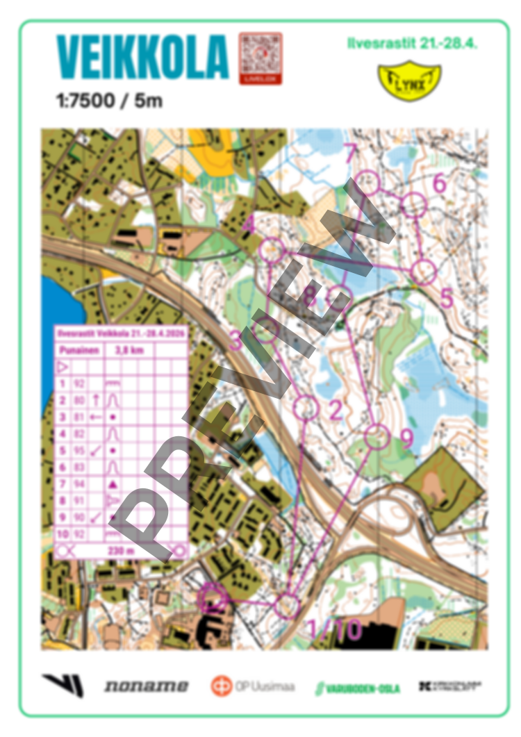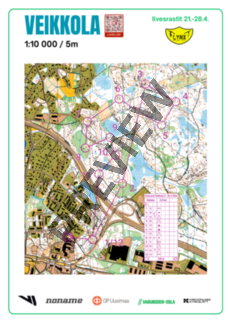 Ratojen lähtö on Veikkolan koulun pihapiirissä, mutta lähtöpaikalla ei ole rastilippua eikä nauhaa. Radoilla mennään moottoritien yli Veikkolan rampin kohdalla ylikulkusiltaa pitkin.